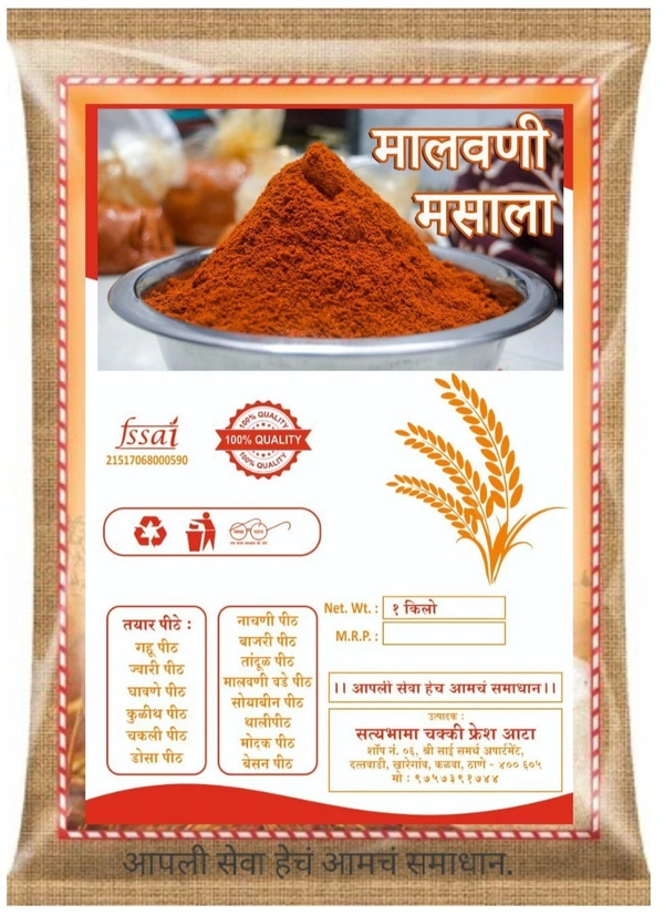 आमची दर्जेदार उत्पादने:सत्यभामा मालवणी मसाला / चिकन/मटन मसाला / आगरी मसाला / फिश मसाला / गरम मसाला / किचन किंग मसाला / बिर्याणी मसाला / तंदुरी मसाला / मिसळ मसाला / गोडा मसाला / चाट मसाला / सांबर मसाला / सत्यभामा भाजी मसाला / कांदा-लसूण मसाला / घाटी मसाला / छोले मसाला / सोलपुरी मसाला / मिसळ मसाला / पाणी-पुरी मसाला / पाव-भाजी मसाला / लवंग पावडर / दालचीनी पावडर / कळीमिरी पावडर / वेलची पावडर / जायफळ पावडर / सुंठ पावडर / धनिया पावडर / बेडगी मिरची पावडर / काश्मिरी मिरची पावडर / शंखेश्वरी मिरची पावडर / लवंगी मिरची पावडर / स्पेशल हळद पावडर/ज्वारी/चणाडाळ/बाजरी/तांदूळ कणी/गहू/नाचणी/वाडा कोलम राईस/वाडा कोलम जीरा राईस/बासमती तुकडा/आंबेमोहोर राईस/इंद्रायणी राईस/Little Millet-Flour/ Kodo Millet - Flour /Foxtel Millet - Flour /Barnyard Millet - Flour /Brown top Millet - Flour आणि इतर........